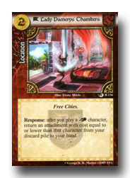 | Collectible card game "A Game of Thrones" Expansion "A Throne Of Blades" Publisher: Fantasy Flight Games Below you find two cards of the newest set. Click on the cards to see the original artwork. |